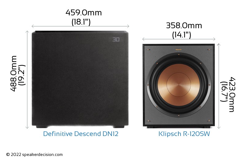 Comparison image of Definitive DN12 and Klipsch R-120SW Size and External Dimensions