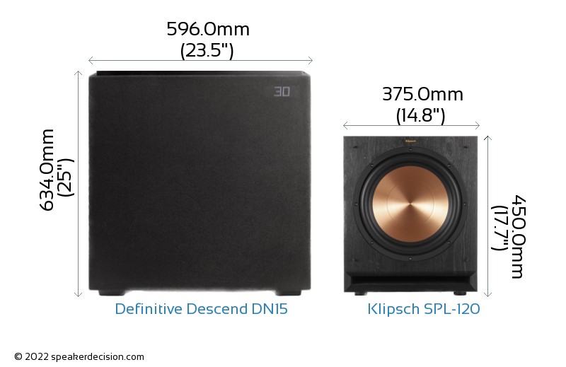Comparison image of Definitive DN15 and Klipsch SPL-120 Size and External Dimensions