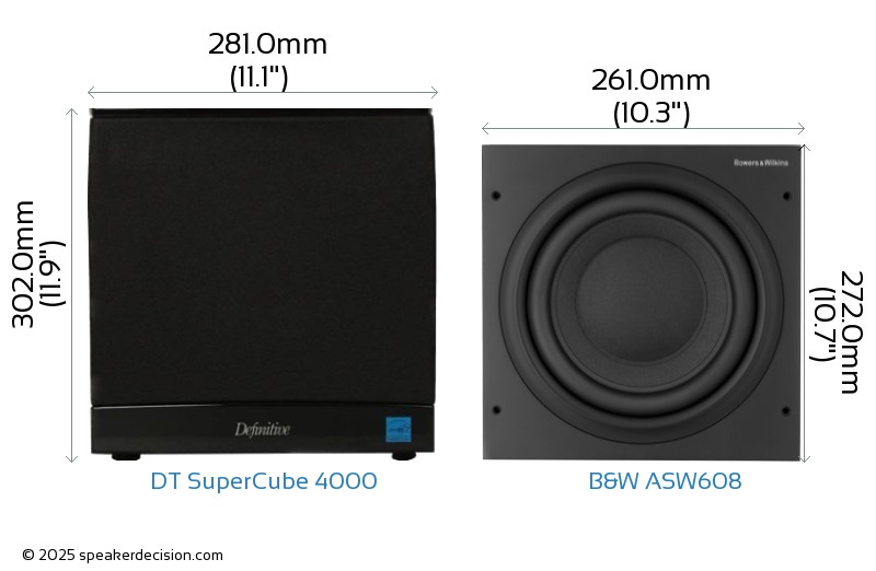 B&W ASW608 is 20mm narrower and 30mm shorter than DT SuperCube 4000 but it is also 32mm deeper.