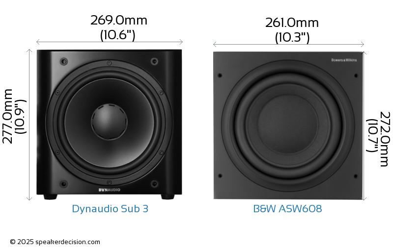 Size of a speaker can sometimes become an important decision factor due to space constraints or in some cases purely for esthetic reasons. In this section, we are going to compare Dynaudio Sub 3's and B&W ASW608's external dimensions. Dynaudio Sub 3 has external dimensions of 277.0 x 269.0 x 366.0mm ( 10-7/8 x 10-9/16 x 14-3/8inch) whereas B&W ASW608 has external dimensions of 272.0 x 261.0 x 350.0mm ( 10-11/16 x 10-1/4 x 13-3/4inch) .