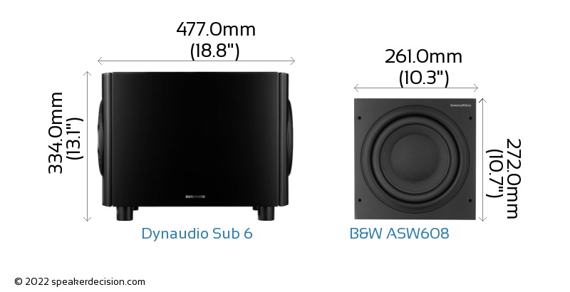 B&W ASW608 is 216mm narrower and 62mm shorter than Dynaudio Sub 6 but it is also 38mm deeper.