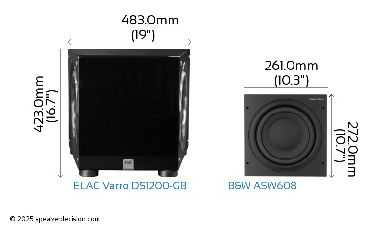 Comparison image of ELAC Varro DS1200-GB and B&W ASW608 Size and External Dimensions