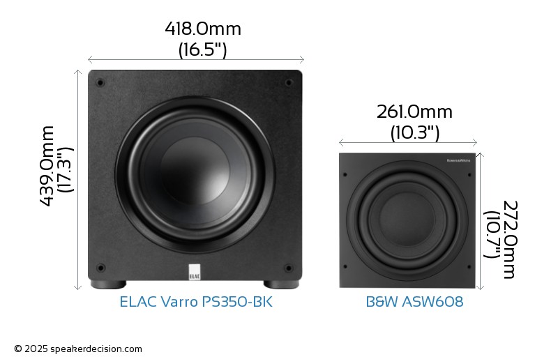 The efficiency of a subwoofer is directly proportional to the total radiating are squared hence the woofer quantity and diameter.Both ELAC Varro PS350-BKand B&W ASW608 have a single woofer setup however the ELAC Varro PS350-BK's woofer is 12-inch whereas the B&W ASW608 features a 8-inch woofer.