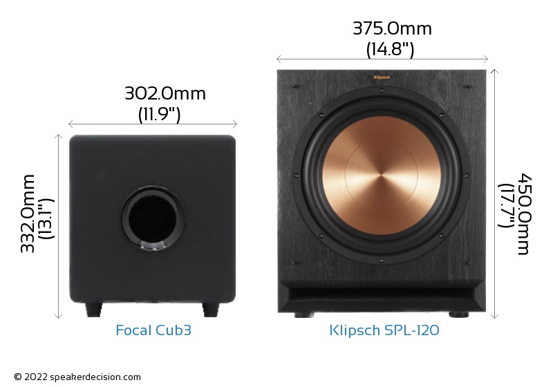 Size of a speaker can sometimes become an important decision factor due to space constraints or in some cases purely for esthetic reasons. In this section, we are going to compare Focal Cub3's and Klipsch SPL-120's external dimensions. Focal Cub3 has external dimensions of 332.0 x 302.0 x 355.0mm ( 13-1/16inch x 11-7/8inch x 13-15/16inch ) whereas Klipsch SPL-120 has external dimensions of 450.0 x 375.0 x 540.0mm ( 17-11/16 x 14-3/4 x 21-1/4inch) .