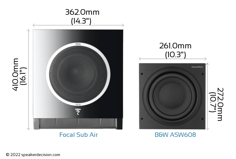 Size of a speaker can sometimes become an important decision factor due to space constraints or in some cases purely for esthetic reasons. In this section, we are going to compare Focal Sub Air's and B&W ASW608's external dimensions. Focal Sub Air has external dimensions of 410.0 x 362.0 x 162.0mm ( 16-1/8 x 14-1/4 x 6-3/8inch) whereas B&W ASW608 has external dimensions of 272.0 x 261.0 x 350.0mm ( 10-11/16 x 10-1/4 x 13-3/4inch) .