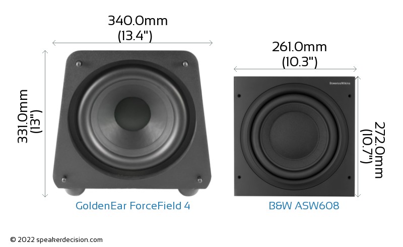 Size of a speaker can sometimes become an important decision factor due to space constraints or in some cases purely for esthetic reasons. In this section, we are going to compare GoldenEar ForceField 4's and B&W ASW608's external dimensions. GoldenEar ForceField 4 has external dimensions of 331.0 x 340.0 x 482.0mm ( 13inch x 13-3/8inch x 18-15/16inch ) whereas B&W ASW608 has external dimensions of 272.0 x 261.0 x 350.0mm ( 10-11/16 x 10-1/4 x 13-3/4inch) .
