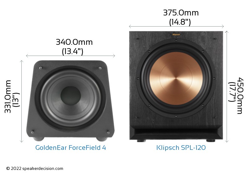 Size of a speaker can sometimes become an important decision factor due to space constraints or in some cases purely for esthetic reasons. In this section, we are going to compare GoldenEar ForceField 4's and Klipsch SPL-120's external dimensions. GoldenEar ForceField 4 has external dimensions of 331.0 x 340.0 x 482.0mm ( 13inch x 13-3/8inch x 18-15/16inch ) whereas Klipsch SPL-120 has external dimensions of 450.0 x 375.0 x 540.0mm ( 17-11/16 x 14-3/4 x 21-1/4inch) .