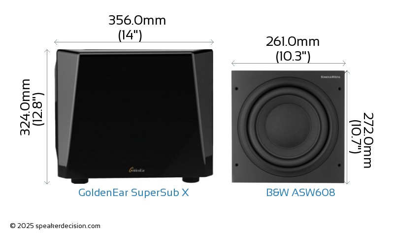 Size of a speaker can sometimes become an important decision factor due to space constraints or in some cases purely for esthetic reasons. In this section, we are going to compare GoldenEar SuperSub X's and B&W ASW608's external dimensions. GoldenEar SuperSub X has external dimensions of 324.0 x 356.0 x 388.0mm ( 12-3/4inch x 14inch x 15-1/4inch ) whereas B&W ASW608 has external dimensions of 272.0 x 261.0 x 350.0mm ( 10-11/16 x 10-1/4 x 13-3/4inch) .