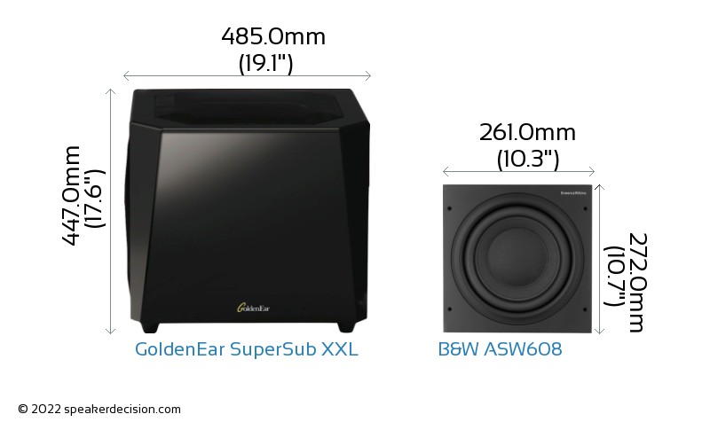 Size of a speaker can sometimes become an important decision factor due to space constraints or in some cases purely for esthetic reasons. In this section, we are going to compare GoldenEar SuperSub XXL's and B&W ASW608's external dimensions. GoldenEar SuperSub XXL has external dimensions of 447.0 x 485.0 x 434.0mm ( 17-9/16inch x 19-1/16inch x 17-1/16inch ) whereas B&W ASW608 has external dimensions of 272.0 x 261.0 x 350.0mm ( 10-11/16 x 10-1/4 x 13-3/4inch) .