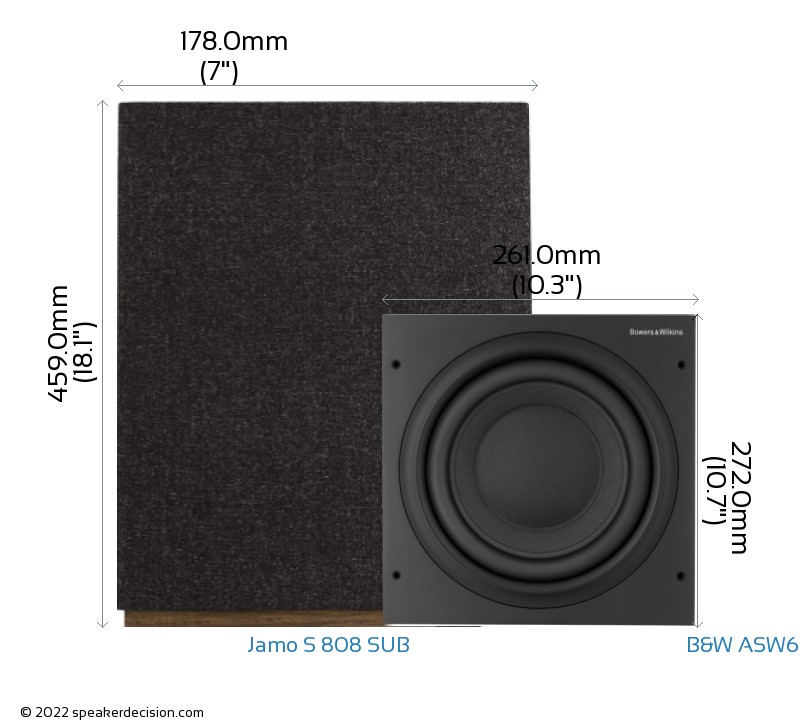 B&W ASW608 is 187mm shorter and 6mm less deeper than Jamo S 808 SUB but it is also 83mm wider.