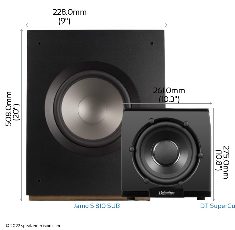 DT SuperCube 2000 is 233mm shorter and 84mm less deeper than Jamo S 810 SUB but it is also 33mm wider.