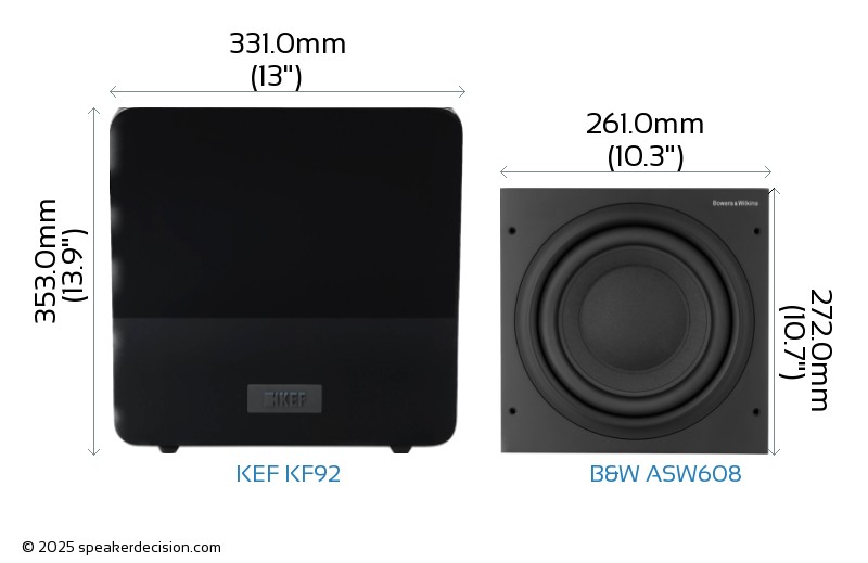 Size of a speaker can sometimes become an important decision factor due to space constraints or in some cases purely for esthetic reasons. In this section, we are going to compare KEF KF92's and B&W ASW608's external dimensions. KEF KF92 has external dimensions of 353.0 x 331.0 x 362.0mm ( 13-7/8 x 13 x 14-1/4inch) whereas B&W ASW608 has external dimensions of 272.0 x 261.0 x 350.0mm ( 10-11/16 x 10-1/4 x 13-3/4inch) .