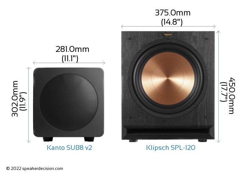Size of a speaker can sometimes become an important decision factor due to space constraints or in some cases purely for esthetic reasons. In this section, we are going to compare Kanto SUB8 v2's and Klipsch SPL-120's external dimensions. Kanto SUB8 v2 has external dimensions of 302.0 x 281.0 x 326.0mm ( 11-7/8inch x 11-1/16inch x 12-13/16inch ) whereas Klipsch SPL-120 has external dimensions of 450.0 x 375.0 x 540.0mm ( 17-11/16 x 14-3/4 x 21-1/4inch) .