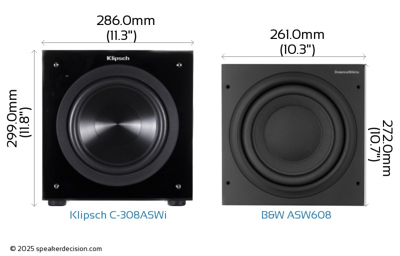 Size of a speaker can sometimes become an important decision factor due to space constraints or in some cases purely for esthetic reasons. In this section, we are going to compare Klipsch C-308ASWi's and B&W ASW608's external dimensions. Klipsch C-308ASWi has external dimensions of 299.0 x 286.0 x 356.0mm ( 11-3/4 x 11-1/4 x 14inch) whereas B&W ASW608 has external dimensions of 272.0 x 261.0 x 350.0mm ( 10-11/16 x 10-1/4 x 13-3/4inch) .