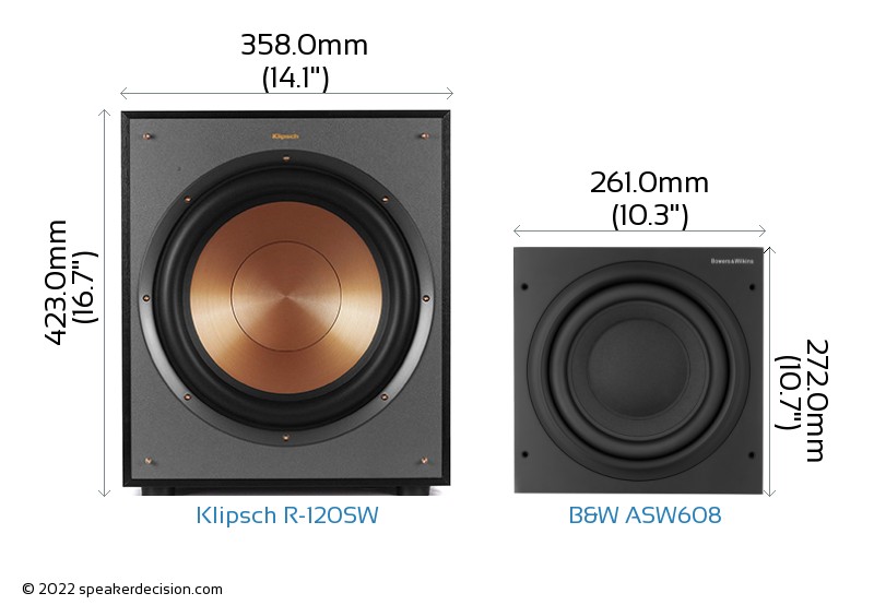 Size of a speaker can sometimes become an important decision factor due to space constraints or in some cases purely for esthetic reasons. In this section, we are going to compare Klipsch R-120SW's and B&W ASW608's external dimensions. Klipsch R-120SW has external dimensions of 423.0 x 358.0 x 532.0mm ( 16-5/8 x 14-1/16 x 20-15/16inch) whereas B&W ASW608 has external dimensions of 272.0 x 261.0 x 350.0mm ( 10-11/16 x 10-1/4 x 13-3/4inch) .