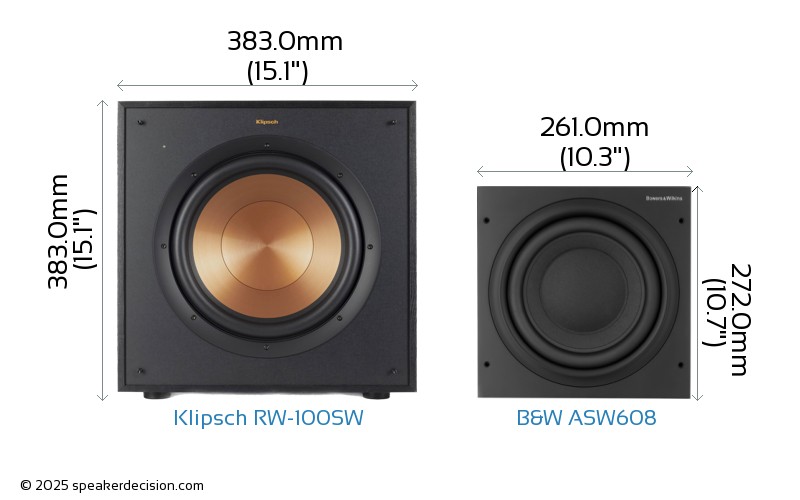 Size of a speaker can sometimes become an important decision factor due to space constraints or in some cases purely for esthetic reasons. In this section, we are going to compare Klipsch RW-100SW's and B&W ASW608's external dimensions. Klipsch RW-100SW has external dimensions of 383.0 x 383.0 x 472.0mm ( 15-1/16inch x 15-1/16inch x 18-9/16inch ) whereas B&W ASW608 has external dimensions of 272.0 x 261.0 x 350.0mm ( 10-11/16 x 10-1/4 x 13-3/4inch) .