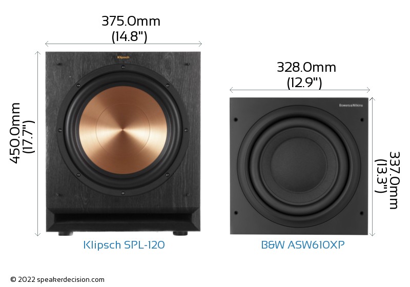Comparison image of Klipsch SPL-120 and B&W ASW610XP Size and External Dimensions