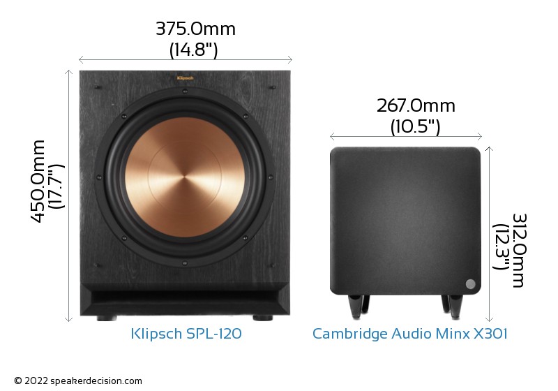 Size of a speaker can sometimes become an important decision factor due to space constraints or in some cases purely for esthetic reasons. In this section, we are going to compare Klipsch SPL-120's and Cambridge Audio Minx X301's external dimensions. Klipsch SPL-120 has external dimensions of 450.0 x 375.0 x 540.0mm ( 17-11/16 x 14-3/4 x 21-1/4inch) whereas Cambridge Audio Minx X301 has external dimensions of 312.0 x 267.0 x 310.0mm ( 12-1/4 x 10-1/2 x 12-3/16inch) .