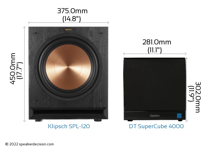Size of a speaker can sometimes become an important decision factor due to space constraints or in some cases purely for esthetic reasons. In this section, we are going to compare Klipsch SPL-120's and DT SuperCube 4000's external dimensions. Klipsch SPL-120 has external dimensions of 450.0 x 375.0 x 540.0mm ( 17-11/16 x 14-3/4 x 21-1/4inch) whereas DT SuperCube 4000 has external dimensions of 302.0 x 281.0 x 318.0mm ( 11-7/8 x 11-1/16 x 12-1/2inch) .