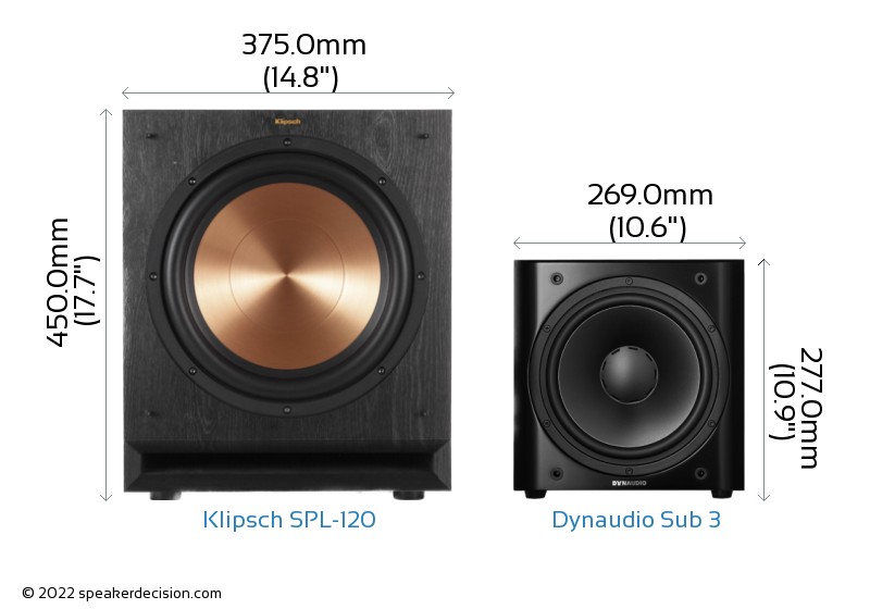Size of a speaker can sometimes become an important decision factor due to space constraints or in some cases purely for esthetic reasons. In this section, we are going to compare Klipsch SPL-120's and Dynaudio Sub 3's external dimensions. Klipsch SPL-120 has external dimensions of 450.0 x 375.0 x 540.0mm ( 17-11/16 x 14-3/4 x 21-1/4inch) whereas Dynaudio Sub 3 has external dimensions of 277.0 x 269.0 x 366.0mm ( 10-7/8 x 10-9/16 x 14-3/8inch) .