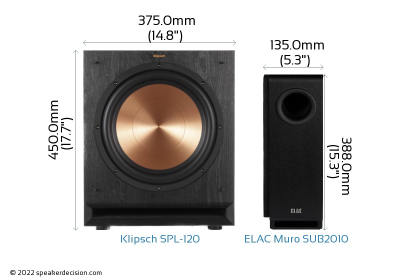 Size of a speaker can sometimes become an important decision factor due to space constraints or in some cases purely for esthetic reasons. In this section, we are going to compare Klipsch SPL-120's and ELAC Muro SUB2010's external dimensions. Klipsch SPL-120 has external dimensions of 450.0 x 375.0 x 540.0mm ( 17-11/16 x 14-3/4 x 21-1/4inch) whereas ELAC Muro SUB2010 has external dimensions of 388.0 x 135.0 x 405.0mm ( 15-1/4 x 5-5/16 x 15-15/16inch) .