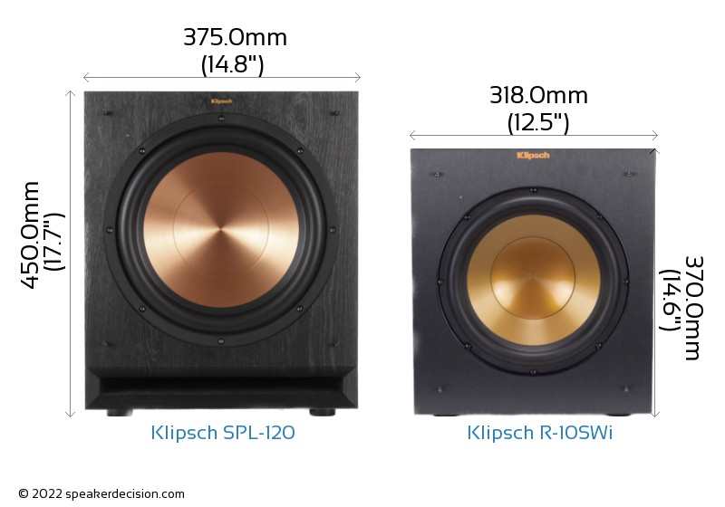 Size of a speaker can sometimes become an important decision factor due to space constraints or in some cases purely for esthetic reasons. In this section, we are going to compare Klipsch SPL-120's and Klipsch R-10SWi's external dimensions. Klipsch SPL-120 has external dimensions of 450.0 x 375.0 x 540.0mm ( 17-11/16 x 14-3/4 x 21-1/4inch) whereas Klipsch R-10SWi has external dimensions of 370.0 x 318.0 x 462.0mm ( 14-9/16 x 12-1/2 x 18-3/16inch) .