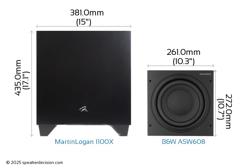 Size of a speaker can sometimes become an important decision factor due to space constraints or in some cases purely for esthetic reasons. In this section, we are going to compare MartinLogan 1100X's and B&W ASW608's external dimensions. MartinLogan 1100X has external dimensions of 435.0 x 381.0 x 410.0mm ( 17-1/8 x 15 x 16-1/8inch) whereas B&W ASW608 has external dimensions of 272.0 x 261.0 x 350.0mm ( 10-11/16 x 10-1/4 x 13-3/4inch) .
