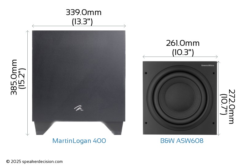 Size of a speaker can sometimes become an important decision factor due to space constraints or in some cases purely for esthetic reasons. In this section, we are going to compare MartinLogan 400's and B&W ASW608's external dimensions. MartinLogan 400 has external dimensions of 385.0 x 339.0 x 388.0mm ( 15-1/8 x 13-5/16 x 15-1/4inch) whereas B&W ASW608 has external dimensions of 272.0 x 261.0 x 350.0mm ( 10-11/16 x 10-1/4 x 13-3/4inch) .
