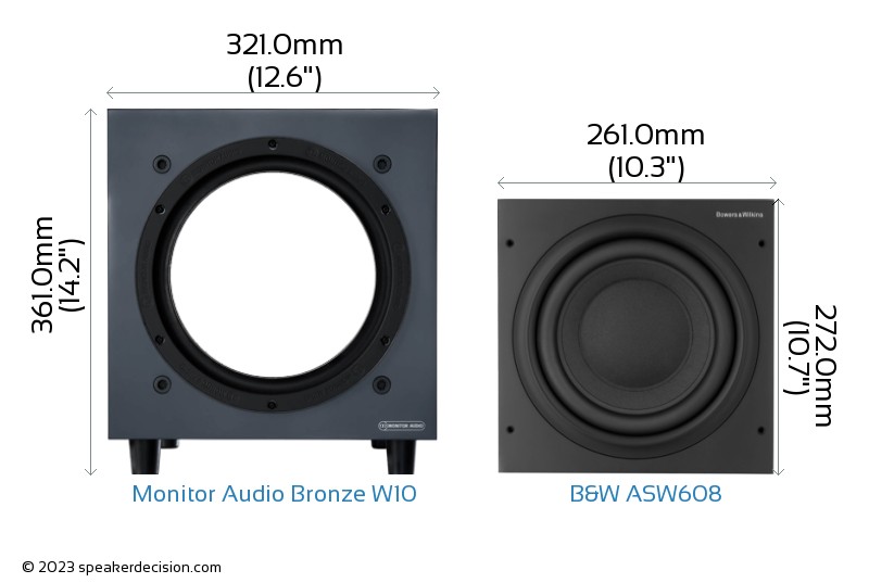 Size of a speaker can sometimes become an important decision factor due to space constraints or in some cases purely for esthetic reasons. In this section, we are going to compare Monitor Audio Bronze W10's and B&W ASW608's external dimensions. Monitor Audio Bronze W10 has external dimensions of 361.0 x 321.0 x 405.0mm ( 14-3/16 x 12-5/8 x 15-15/16inch) whereas B&W ASW608 has external dimensions of 272.0 x 261.0 x 350.0mm ( 10-11/16 x 10-1/4 x 13-3/4inch) .