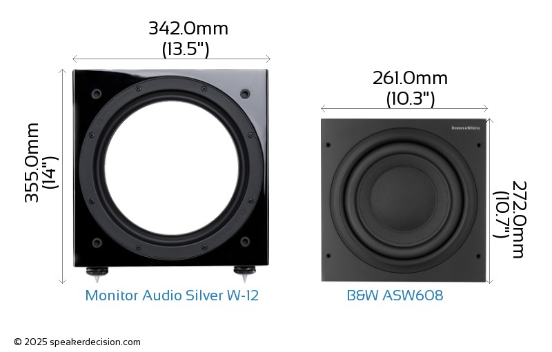 Size of a speaker can sometimes become an important decision factor due to space constraints or in some cases purely for esthetic reasons. In this section, we are going to compare Monitor Audio Silver W-12's and B&W ASW608's external dimensions. Monitor Audio Silver W-12 has external dimensions of 355.0 x 342.0 x 445.0mm ( 13-15/16 x 13-7/16 x 17-1/2inch) whereas B&W ASW608 has external dimensions of 272.0 x 261.0 x 350.0mm ( 10-11/16 x 10-1/4 x 13-3/4inch) .