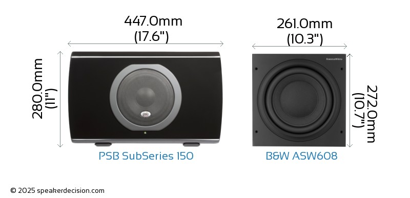 Size of a speaker can sometimes become an important decision factor due to space constraints or in some cases purely for esthetic reasons. In this section, we are going to compare PSB SubSeries 150's and B&W ASW608's external dimensions. PSB SubSeries 150 has external dimensions of 280.0 x 447.0 x 143.0mm ( 11 x 17-9/16 x 5-5/8inch) whereas B&W ASW608 has external dimensions of 272.0 x 261.0 x 350.0mm ( 10-11/16 x 10-1/4 x 13-3/4inch) .