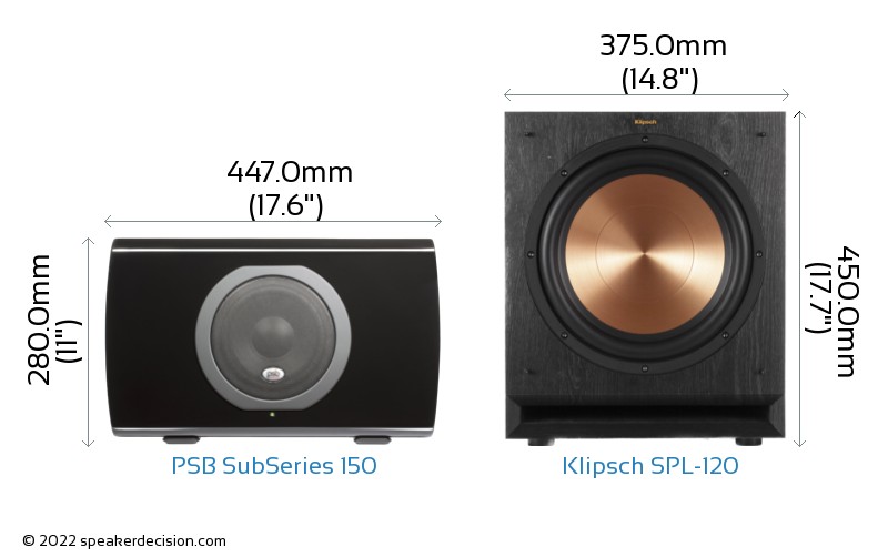 Size of a speaker can sometimes become an important decision factor due to space constraints or in some cases purely for esthetic reasons. In this section, we are going to compare PSB SubSeries 150's and Klipsch SPL-120's external dimensions. PSB SubSeries 150 has external dimensions of 280.0 x 447.0 x 143.0mm ( 11 x 17-9/16 x 5-5/8inch) whereas Klipsch SPL-120 has external dimensions of 450.0 x 375.0 x 540.0mm ( 17-11/16 x 14-3/4 x 21-1/4inch) .