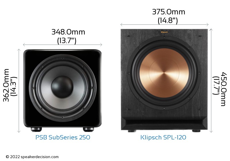 Size of a speaker can sometimes become an important decision factor due to space constraints or in some cases purely for esthetic reasons. In this section, we are going to compare PSB SubSeries 250's and Klipsch SPL-120's external dimensions. PSB SubSeries 250 has external dimensions of 362.0 x 348.0 x 397.0mm ( 14-1/4 x 13-11/16 x 15-5/8inch) whereas Klipsch SPL-120 has external dimensions of 450.0 x 375.0 x 540.0mm ( 17-11/16 x 14-3/4 x 21-1/4inch) .
