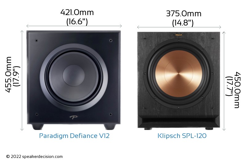 Klipsch SPL-120 is 46mm narrower and 5mm shorter than Paradigm Defiance V12 but it is also 54mm deeper.