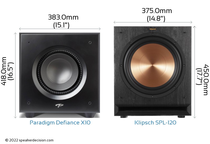 Paradigm Defiance X10 is 32mm shorter and 87mm less deeper than Klipsch SPL-120 but it is also 8mm wider.