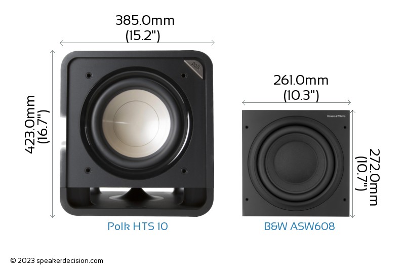 Comparison image of Polk HTS 10 and B&W ASW608 Size and External Dimensions