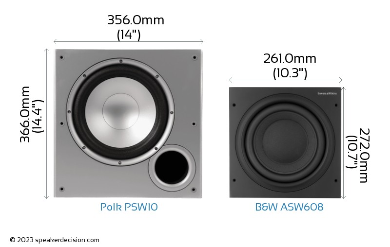 Polk PSW10 is clearly the larger of the two speakers. Its body is 95mm wider, 94mm taller and 62mm deeper than B&W ASW608.