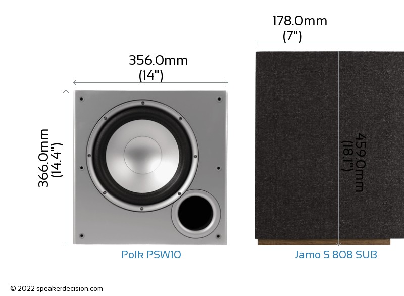 Jamo S 808 SUB is 178mm narrower and 56mm less deeper than Polk PSW10 but it is also 93mm taller.