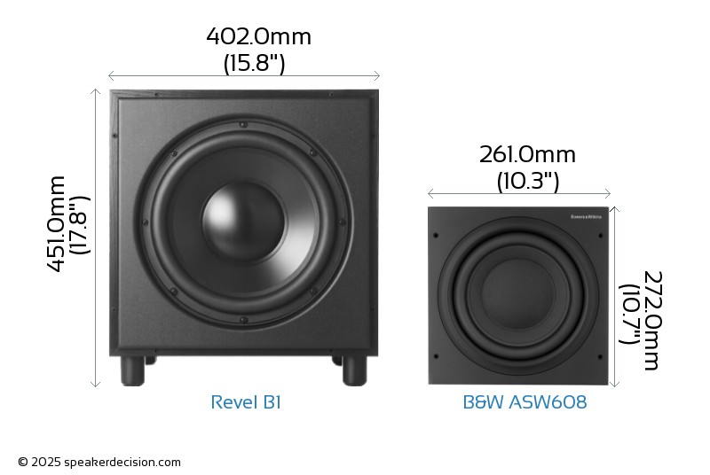 Size of a speaker can sometimes become an important decision factor due to space constraints or in some cases purely for esthetic reasons. In this section, we are going to compare Revel B1's and B&W ASW608's external dimensions. Revel B1 has external dimensions of 451.0 x 402.0 x 391.0mm ( 17-3/4 x 15-13/16 x 15-3/8inch) whereas B&W ASW608 has external dimensions of 272.0 x 261.0 x 350.0mm ( 10-11/16 x 10-1/4 x 13-3/4inch) .