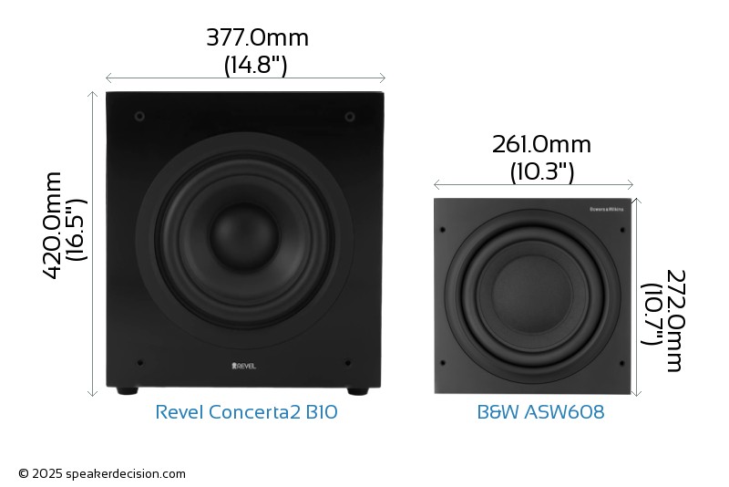 Size of a speaker can sometimes become an important decision factor due to space constraints or in some cases purely for esthetic reasons. In this section, we are going to compare Revel Concerta2 B10's and B&W ASW608's external dimensions. Revel Concerta2 B10 has external dimensions of 420.0 x 377.0 x 440.0mm ( 16-1/2 x 14-13/16 x 17-5/16inch) whereas B&W ASW608 has external dimensions of 272.0 x 261.0 x 350.0mm ( 10-11/16 x 10-1/4 x 13-3/4inch) .
