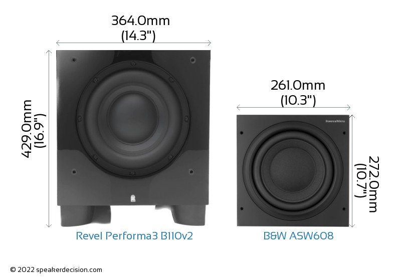 Size of a speaker can sometimes become an important decision factor due to space constraints or in some cases purely for esthetic reasons. In this section, we are going to compare Revel Performa3 B110v2's and B&W ASW608's external dimensions. Revel Performa3 B110v2 has external dimensions of 429.0 x 364.0 x 393.0mm ( 16-7/8inch x 14-5/16inch x 15-7/16inch ) whereas B&W ASW608 has external dimensions of 272.0 x 261.0 x 350.0mm ( 10-11/16 x 10-1/4 x 13-3/4inch) .