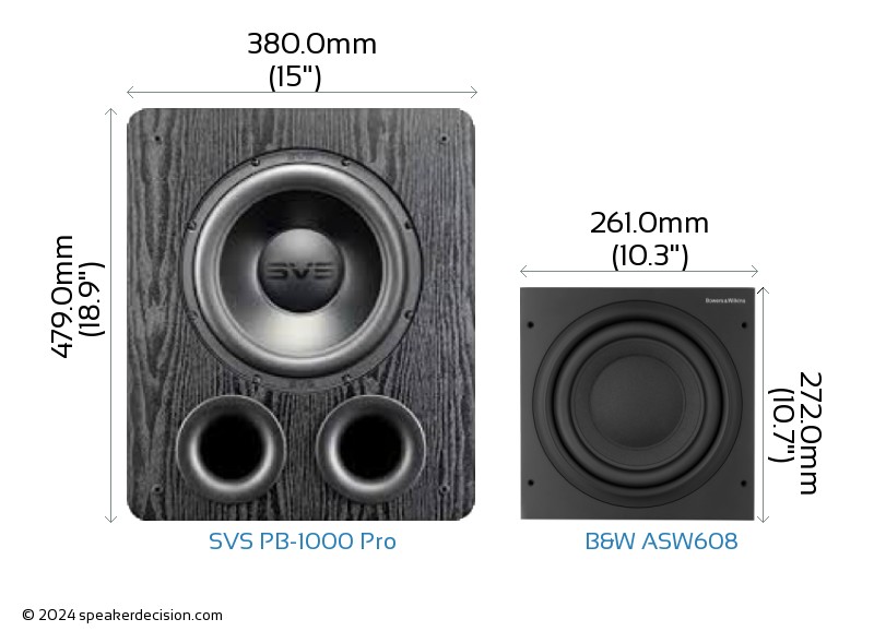 Size of a speaker can sometimes become an important decision factor due to space constraints or in some cases purely for esthetic reasons. In this section, we are going to compare SVS PB-1000 Pro's and B&W ASW608's external dimensions. SVS PB-1000 Pro has external dimensions of 479.0 x 380.0 x 509.0mm ( 18-13/16inch x 15inch x 20-15/16inch ) whereas B&W ASW608 has external dimensions of 272.0 x 261.0 x 350.0mm ( 10-11/16 x 10-1/4 x 13-3/4inch) .