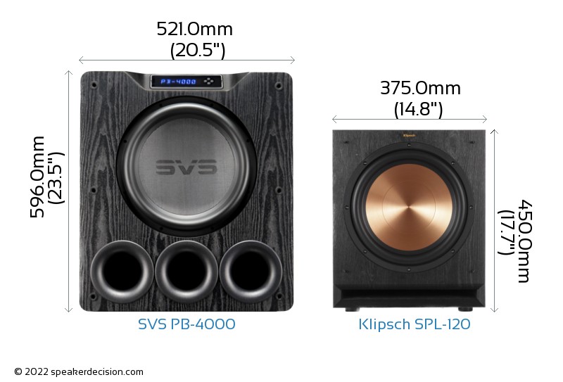 Size of a speaker can sometimes become an important decision factor due to space constraints or in some cases purely for esthetic reasons. In this section, we are going to compare SVS PB-4000's and Klipsch SPL-120's external dimensions. SVS PB-4000 has external dimensions of 596.0 x 521.0 x 762.0mm ( 23-7/16 x 20-1/2 x 30inch) whereas Klipsch SPL-120 has external dimensions of 450.0 x 375.0 x 540.0mm ( 17-11/16 x 14-3/4 x 21-1/4inch) .