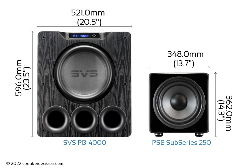 Size of a speaker can sometimes become an important decision factor due to space constraints or in some cases purely for esthetic reasons. In this section, we are going to compare SVS PB-4000's and PSB SubSeries 250's external dimensions. SVS PB-4000 has external dimensions of 596.0 x 521.0 x 762.0mm ( 23-7/16 x 20-1/2 x 30inch) whereas PSB SubSeries 250 has external dimensions of 362.0 x 348.0 x 397.0mm ( 14-1/4 x 13-11/16 x 15-5/8inch) .