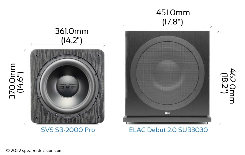 Size of a speaker can sometimes become an important decision factor due to space constraints or in some cases purely for esthetic reasons. In this section, we are going to compare SVS SB-2000 Pro's and ELAC Debut 2.0 SUB3030's external dimensions. SVS SB-2000 Pro has external dimensions of 370.0 x 361.0 x 434.0mm ( 14-9/16 x 14-3/16 x 17-1/16inch) whereas ELAC Debut 2.0 SUB3030 has external dimensions of 462.0 x 451.0 x 464.0mm ( 18-3/16 x 17-3/4 x 18-1/4inch) .