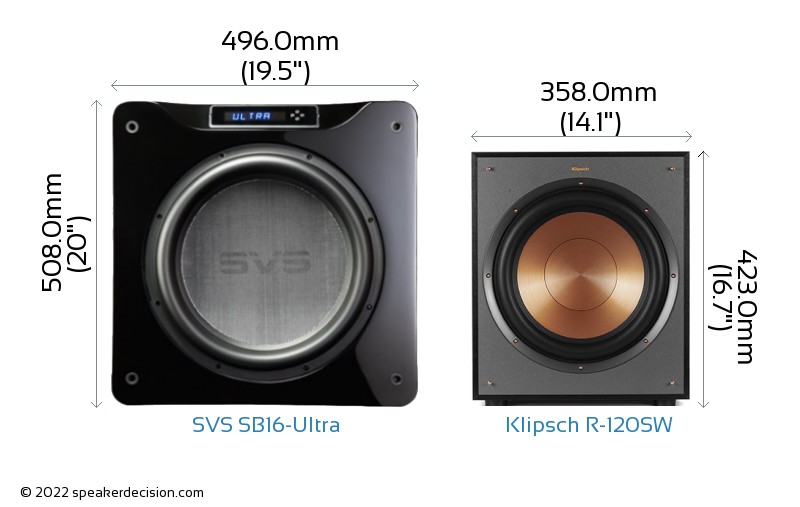 Klipsch R-120SW is 138mm narrower and 85mm shorter than SVS SB16-Ultra but it is also 20mm deeper.