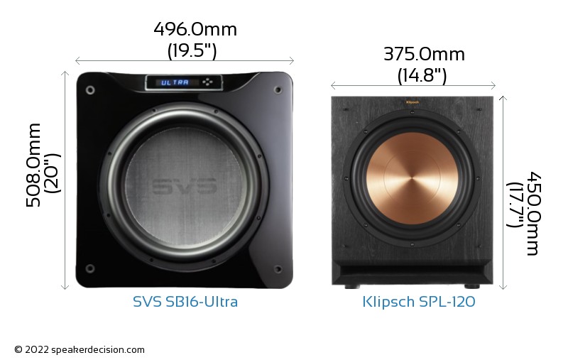 Size of a speaker can sometimes become an important decision factor due to space constraints or in some cases purely for esthetic reasons. In this section, we are going to compare SVS SB16-Ultra's and Klipsch SPL-120's external dimensions. SVS SB16-Ultra has external dimensions of 508.0 x 496.0 x 512.0mm ( 20 x 19-1/2 x 20-1/8inch) whereas Klipsch SPL-120 has external dimensions of 450.0 x 375.0 x 540.0mm ( 17-11/16 x 14-3/4 x 21-1/4inch) .