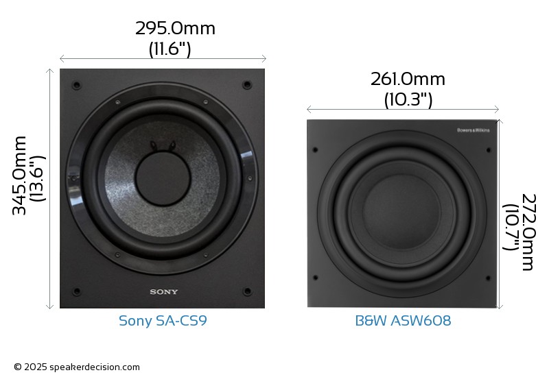 Size of a speaker can sometimes become an important decision factor due to space constraints or in some cases purely for esthetic reasons. In this section, we are going to compare Sony SA-CS9's and B&W ASW608's external dimensions. Sony SA-CS9 has external dimensions of 295 x 345 x 400 mm ( 11.6 x 13.6 x 15.7 inch) whereas B&W ASW608 has external dimensions of 272.0 x 261.0 x 350.0mm ( 10-11/16 x 10-1/4 x 13-3/4inch) .