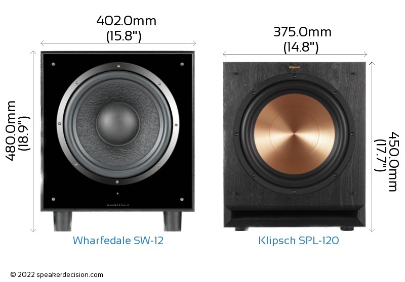 Klipsch SPL-120 is 27mm narrower and 30mm shorter than Wharfedale SW-12 but it is also 28mm deeper.
