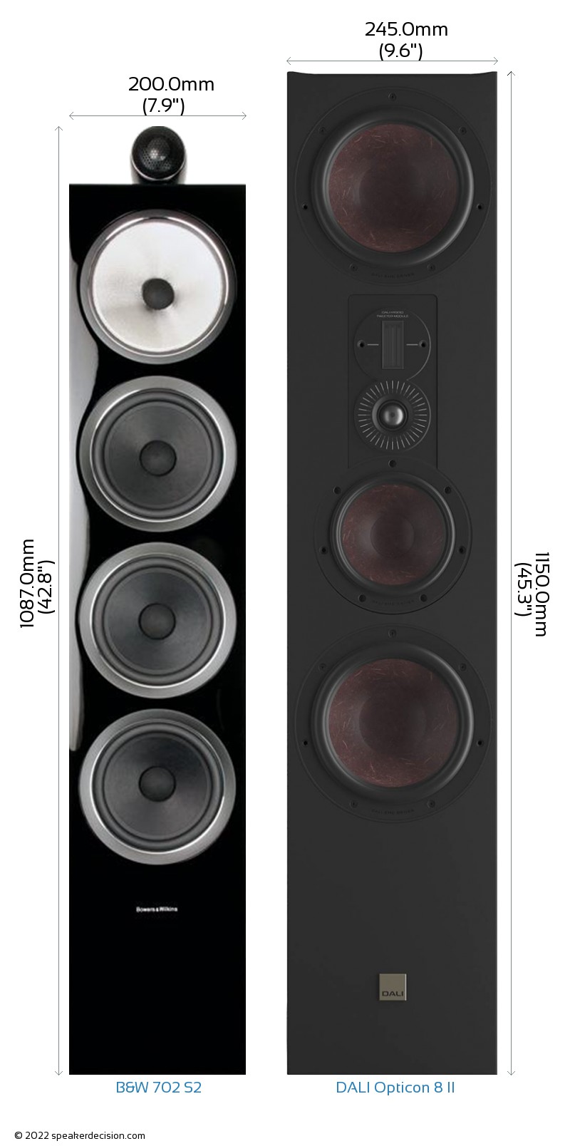 Size of a speaker can sometimes become an important decision factor due to space constraints or in some cases purely for esthetic reasons. In this section, we are going to compare B&W 702 S2's and DALI Opticon 8 II's external dimensions. B&W 702 S2 has external dimensions of 1087.0 x 200.0 x 364.0mm ( 42.8-inch x 14-7/16-inch x 14.3-inch) whereas DALI Opticon 8 II has external dimensions of 1150.0 x 245.0 x 459.0mm ( 45-1/4 x 9-1/2 x 18-1/16inch) .